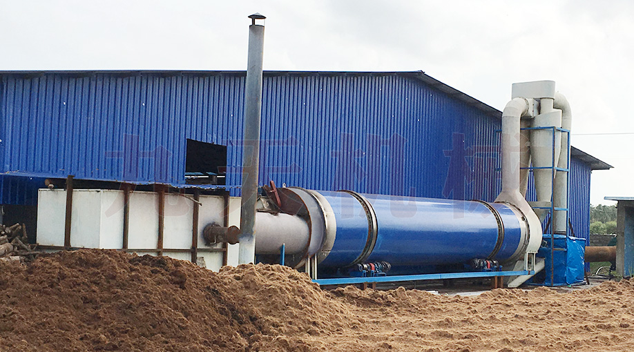 椰糠流程是:經過脫鹽脫水的水分50-60%椰糠由輸送機送入滾筒的實現順流烘干,椰糠在內層的抄板下不斷抄起、散落呈螺旋行進式前進,經過內、中、外三層,實現椰糠和熱風質熱交換,達到干燥效果的椰糠在風力作用下快速行進排出滾筒,沒有達到干燥效果的濕牧草因自重而不能快速行進,椰糠在控制行程內進行充分干燥,由此達到干燥效果,椰糠水分降低到14-18%(客戶要求),完成干燥過程,由螺旋輸送機排出。滾筒內部安裝有特除裝置,防止椰糠干燥不均。